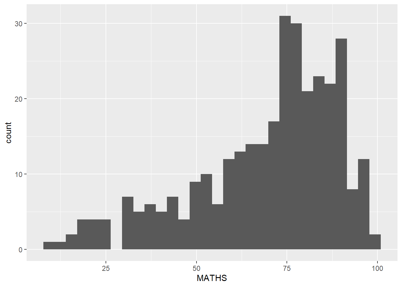 geom_histogram() is used to create a simple histogram by using values in MATHS field of exam_data.