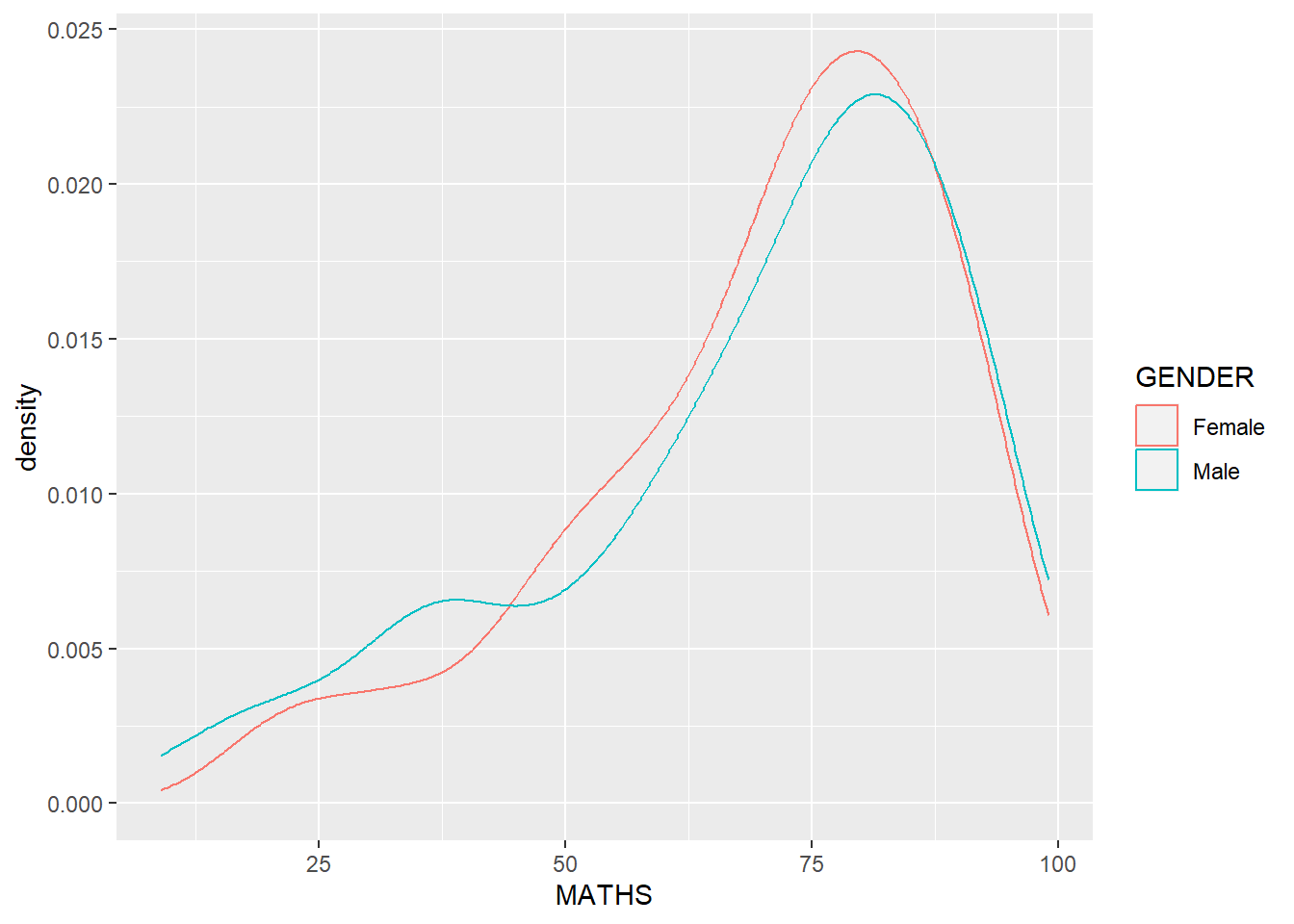 We can plot two kernel density lines by using colour or fill arguments of aes().