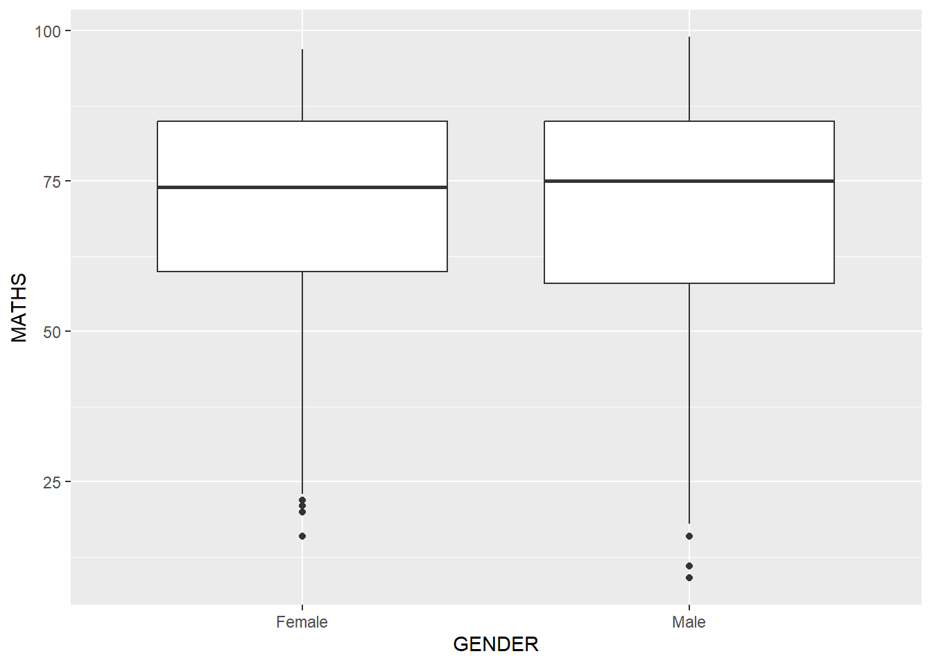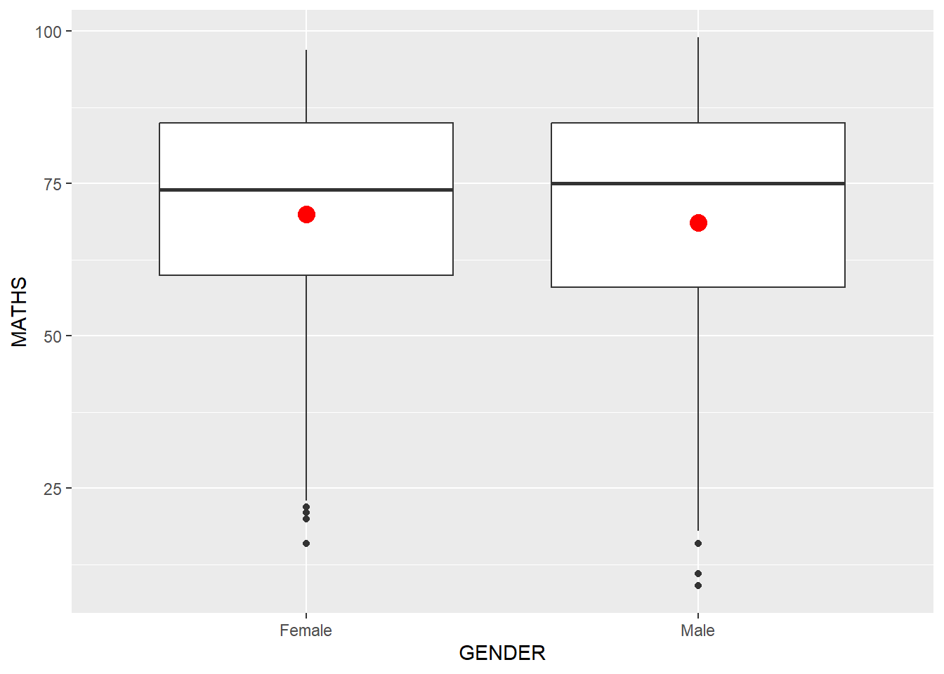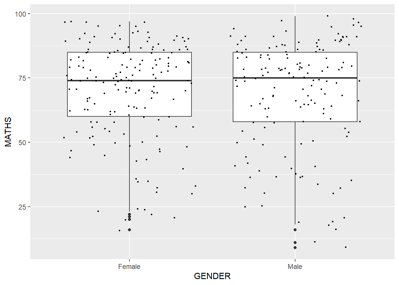 For instance, we can plot the data points on the boxplots by using both geom_boxplot() and geom_point().
