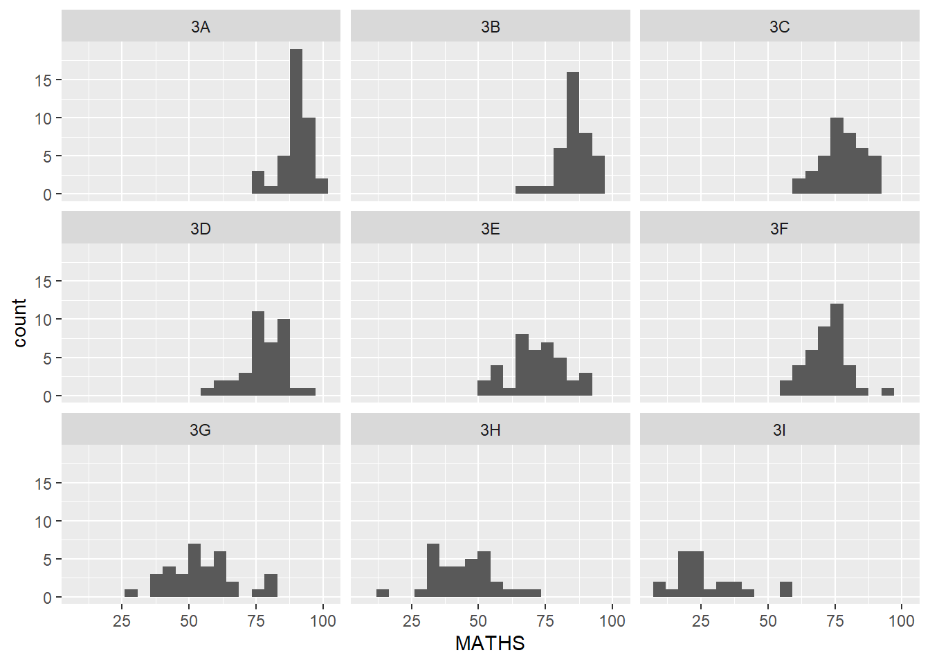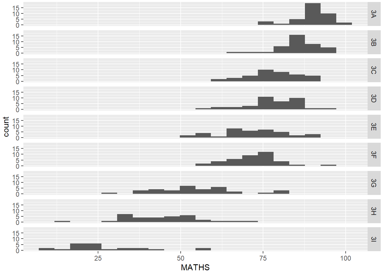 From the above, it’s now more apparent that the maths scores decrease as we move down from Class 3A to Class 3I.