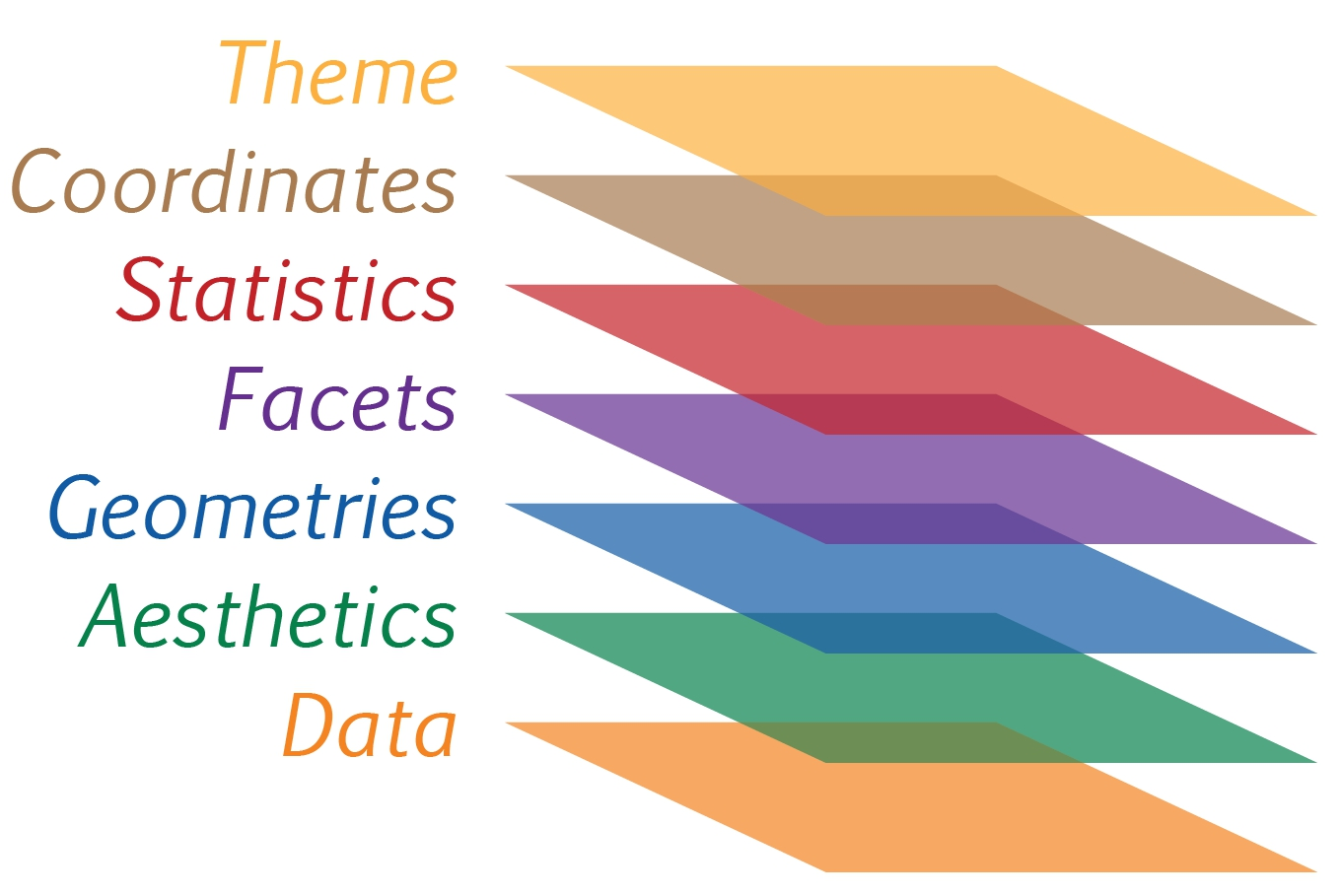 In brief, the grammar tells us that a graphic maps the data to the aesthetic attributes (colour, shape, size) of geometric objects (points, lines, bars). The plot may also include statistical transformations of the data and information about the plot’s coordinate system. Facetting can be used to plot for different subsets of the data. The combination of these independent components are what make up a graphic.