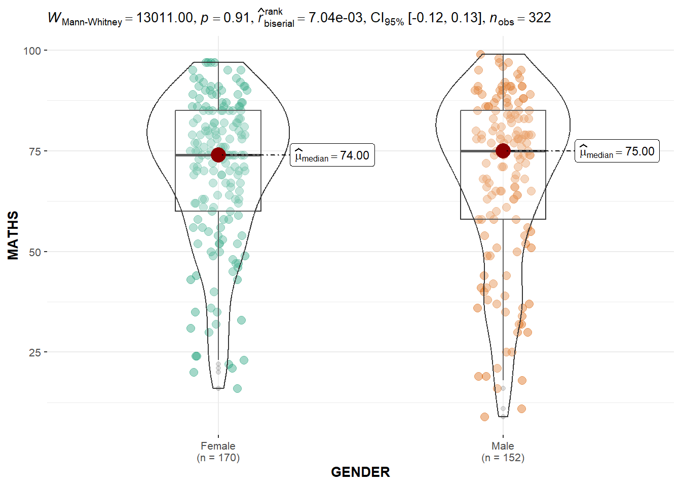 type = "np": specifies the type of test to be used to compare the groups, in this case, a non-parametric test (Wilcoxon-Mann-Whitney test).messages = FALSE: specifies whether or not to display informative messages about the statistical test being performed.