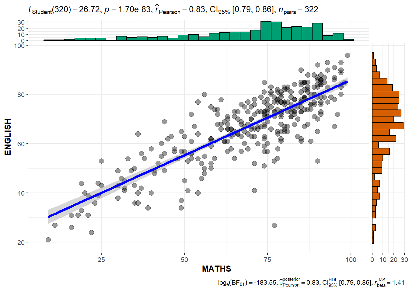 We can use ggscatterstats() to build a visual for Significant Test of Correlation between Maths scores and English scores. This creates a scatter plot with overlaid regression lines between the variables “MATHS” and “ENGLISH” in the “exam” dataset.