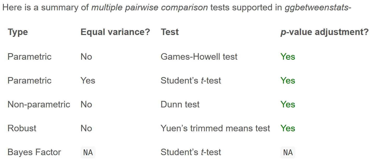 Summary of tests with ggbetweenstats