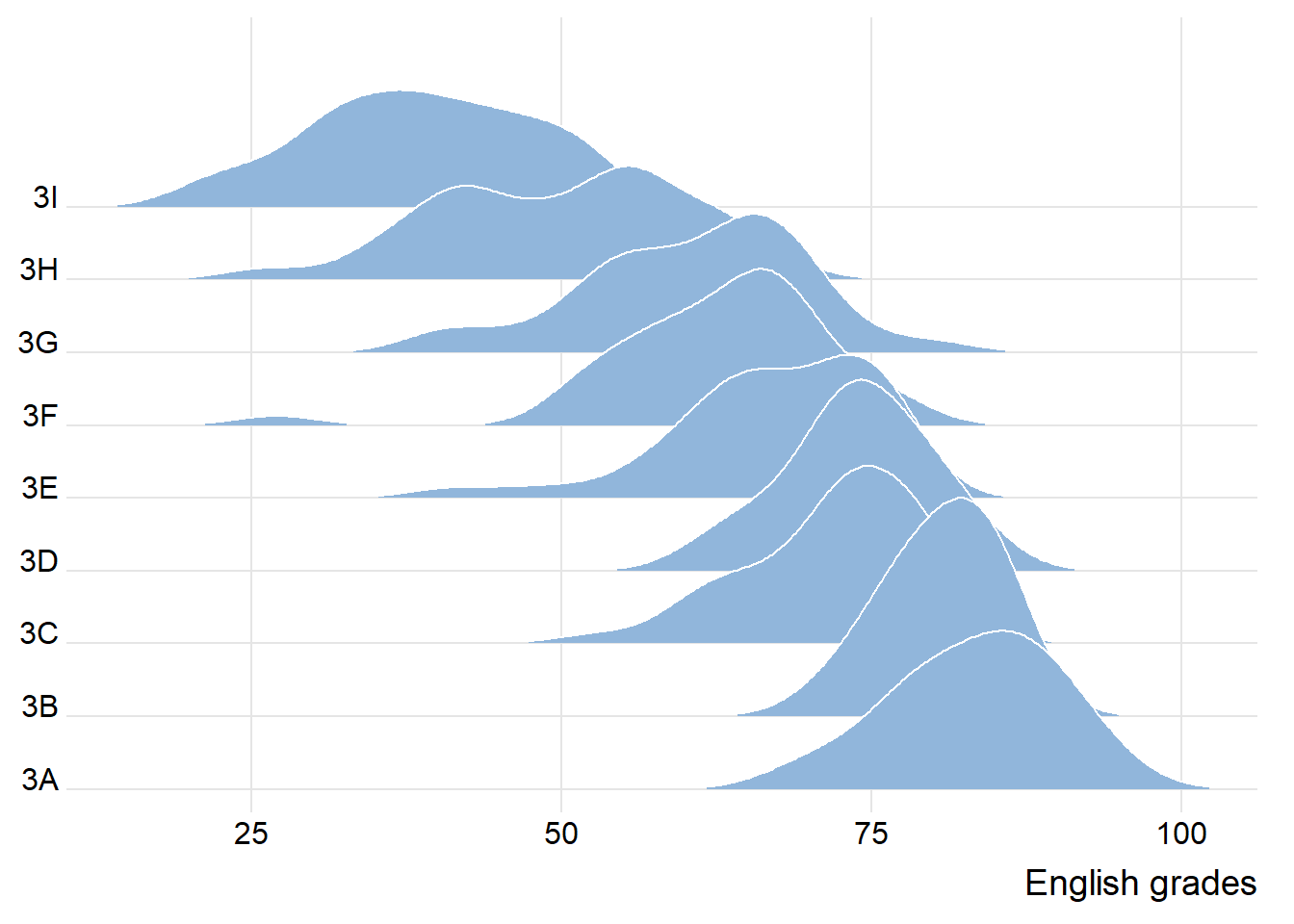 The figure below is a ridgelines plot showing the distribution of English score by class.