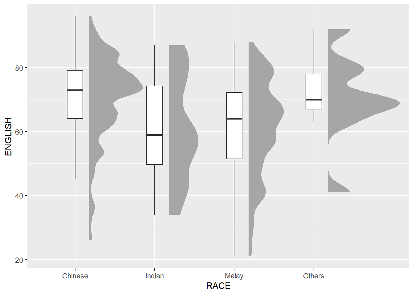 In this section, we will learn how to create a raincloud plot to visualise the distribution of English scores by race. It will be created by using functions provided by ggdist and ggplot2 packages.