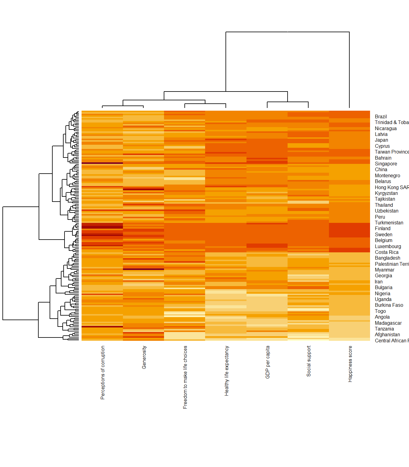 This heatmap is not really informative. Indeed, the Happiness Score variable have relatively higher values, what makes that the other variables with small values all look the same. Thus, we need to normalize this matrix. This is done using the scale argument. It can be applied to rows or to columns.