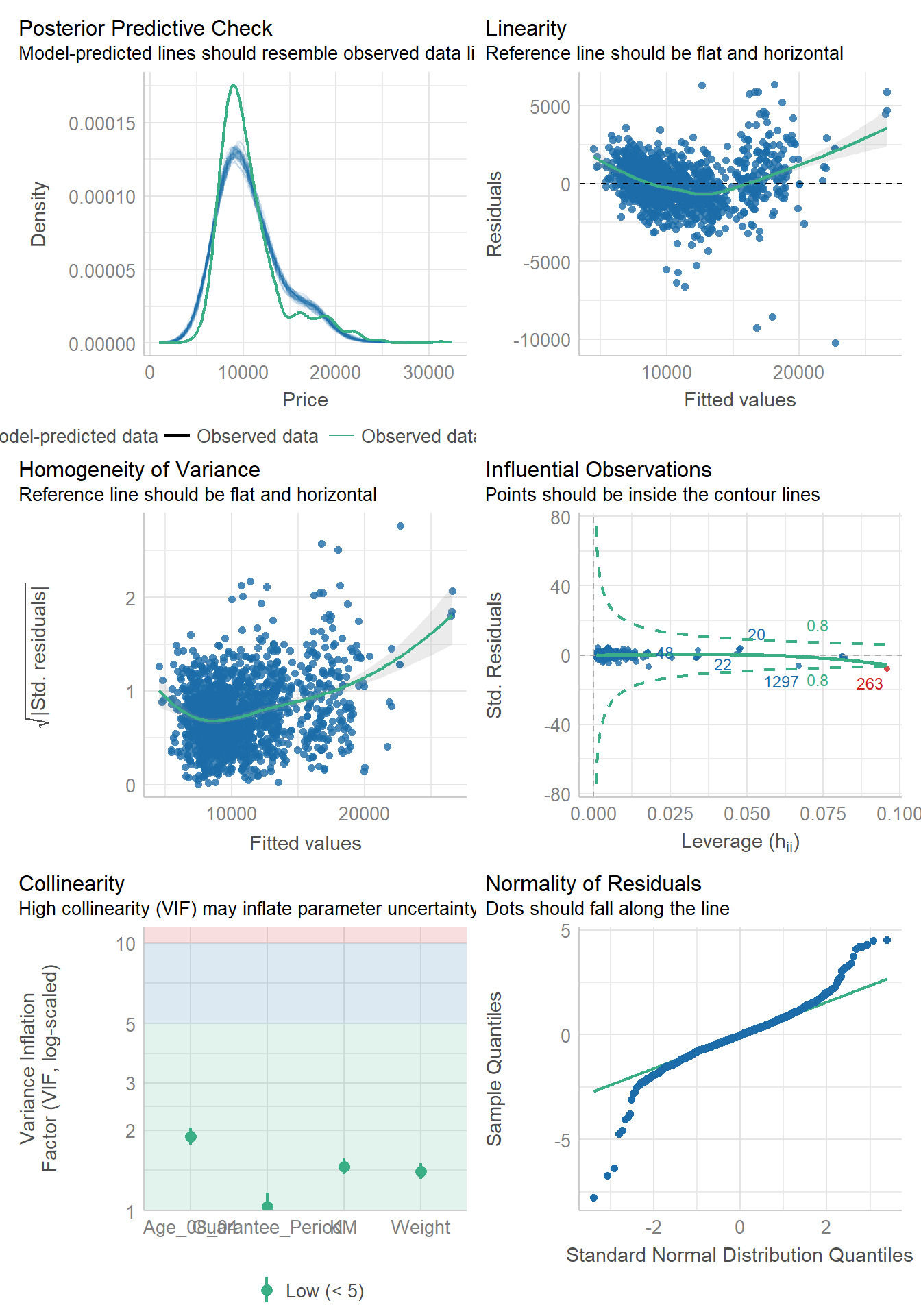 Thank goodness! There’s also a check_model()function to conduct the diagnostic tests discussed above.