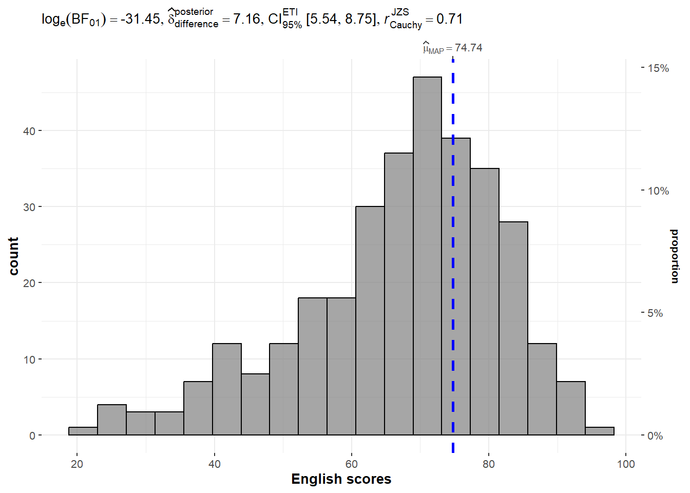 We use gghistostats() to to build an visual of one-sample test on English scores.