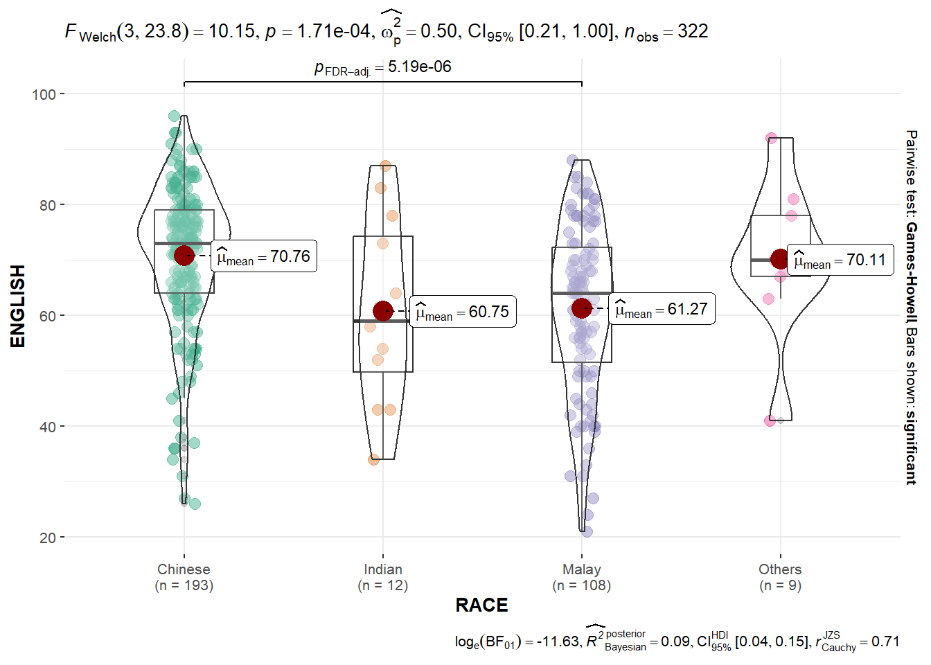 We can also use ggbetweenstats() to build a visual for One-way ANOVA test on English score by race.