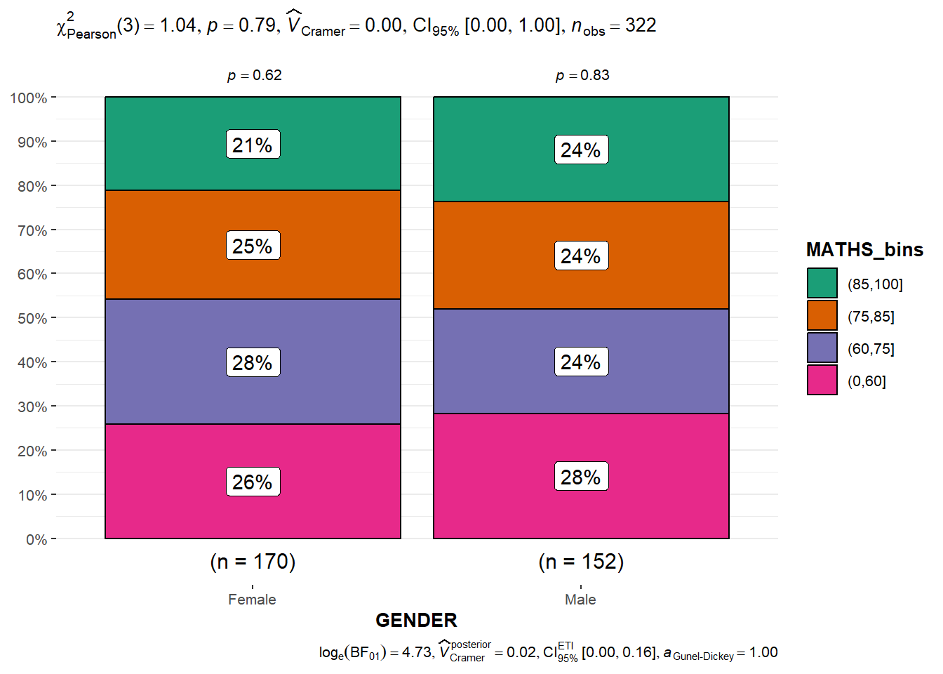 First, we bin the Maths scores into a 4-class variable using cut() function.