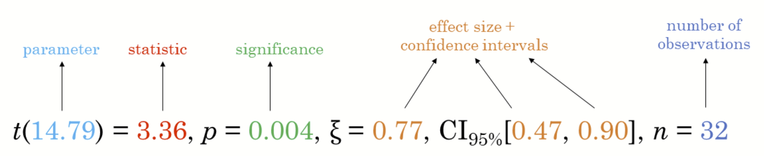 Follows the best practices for statistical reporting. For all statistical tests reported in the plots, the default template abides by the APA gold standard for statistical reporting. For example, here are the results from a t-test: