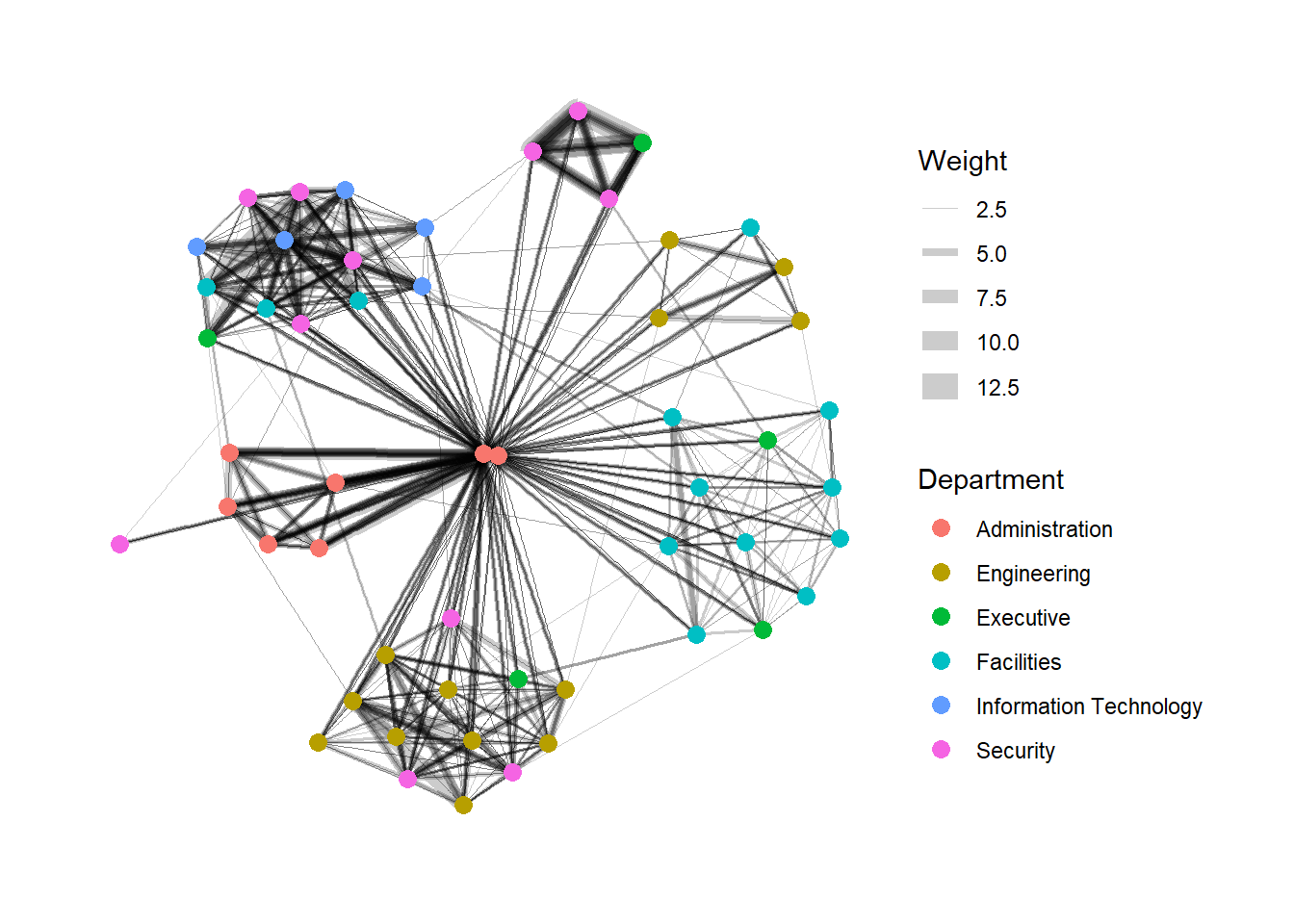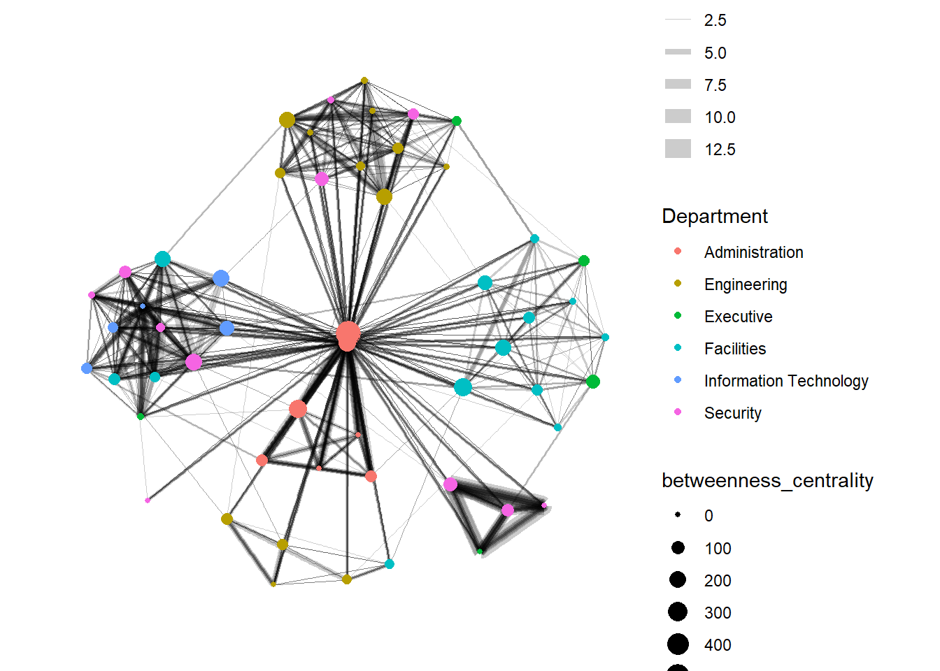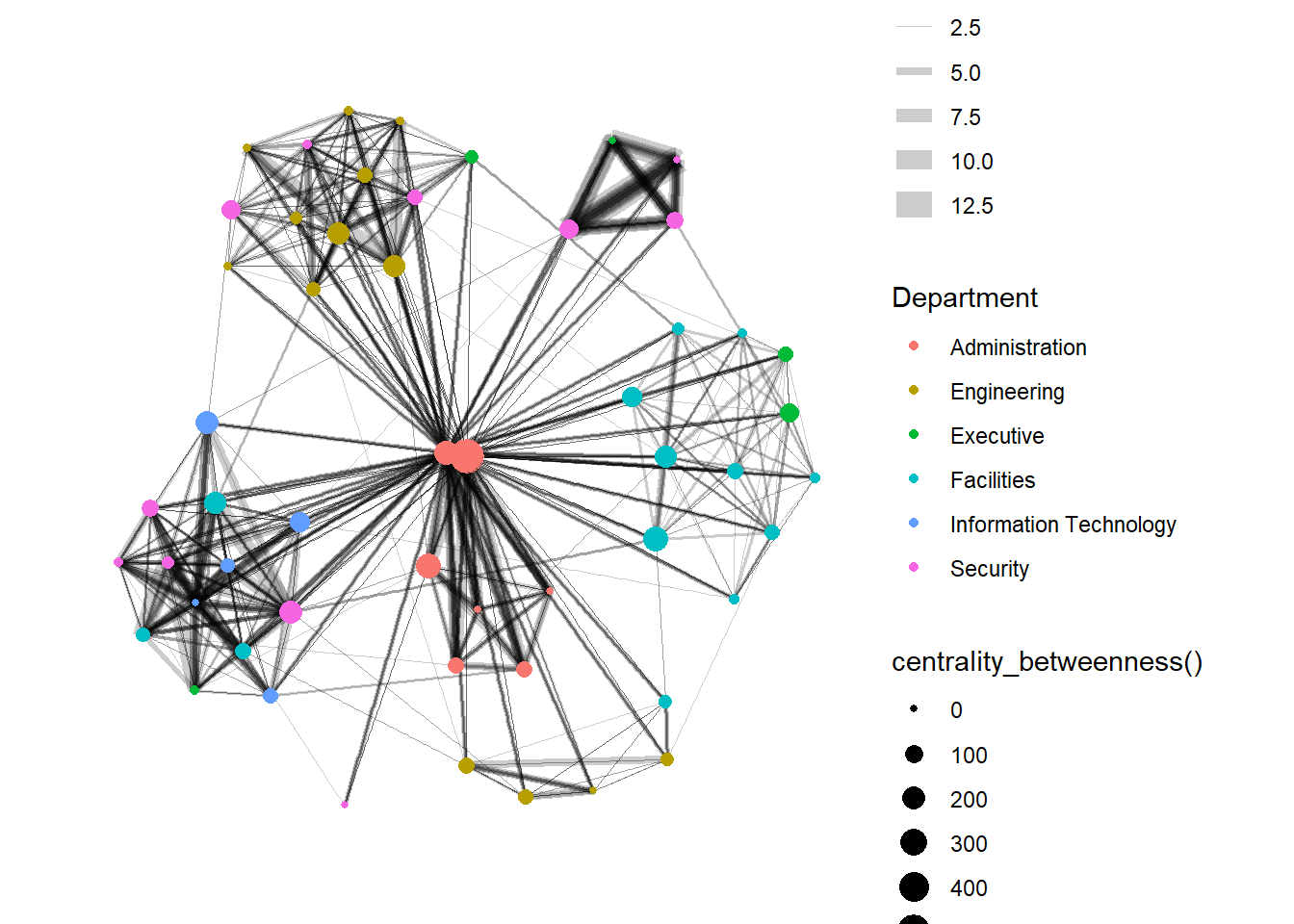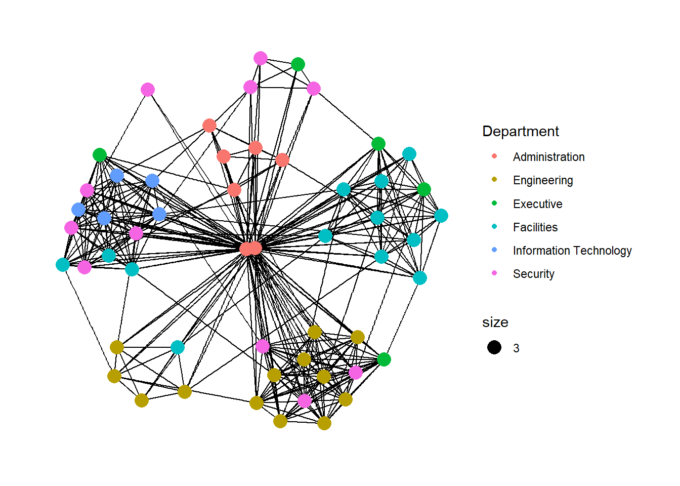 We can use the aes() function within the geom_node_point() function to assign the nodes with colors based on the department of the employees.