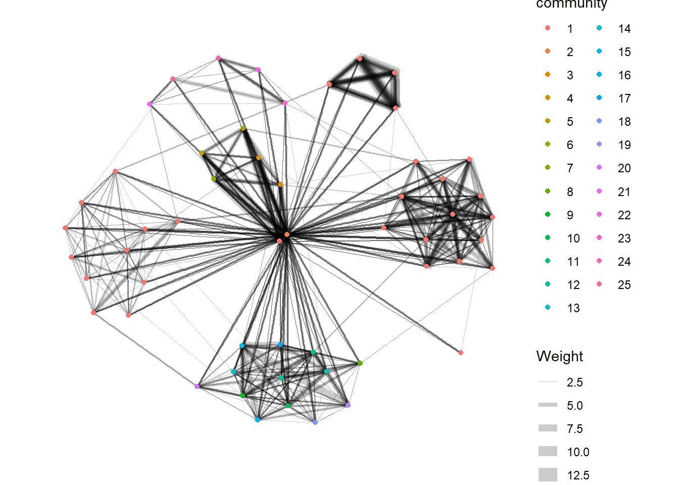 tidygraph package inherits many of the community detection algorithms imbedded into igraph and makes them available to us, including Edge-betweenness (group_edge_betweenness), Leading eigenvector (group_leading_eigen), Fast-greedy (group_fast_greedy), Louvain (group_louvain), Walktrap (group_walktrap), Label propagation (group_label_prop), InfoMAP (group_infomap), Spinglass (group_spinglass), and Optimal (group_optimal). Some community algorithms are designed to take into account direction or weight, while others ignore it. Use this link to find out more about community detection functions provided by tidygraph.