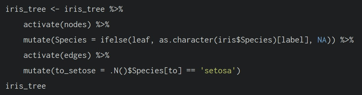 In the above the .N() function is used to gain access to the node data while manipulating the edge data. Similarly .E() will give you the edge data and .G() will give you the tbl_graph object itself.