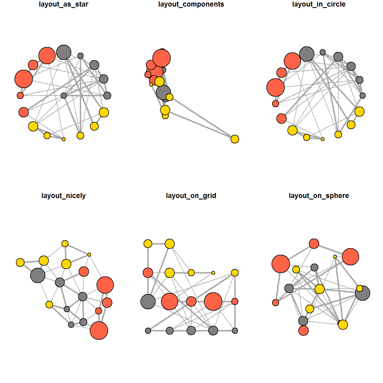 ggraph supports many layouts for standard use. They are: star, circle, nicely (default), dh, gem, graphopt, grid, mds, spahere, randomly, fr, kk, drl and lgl.
