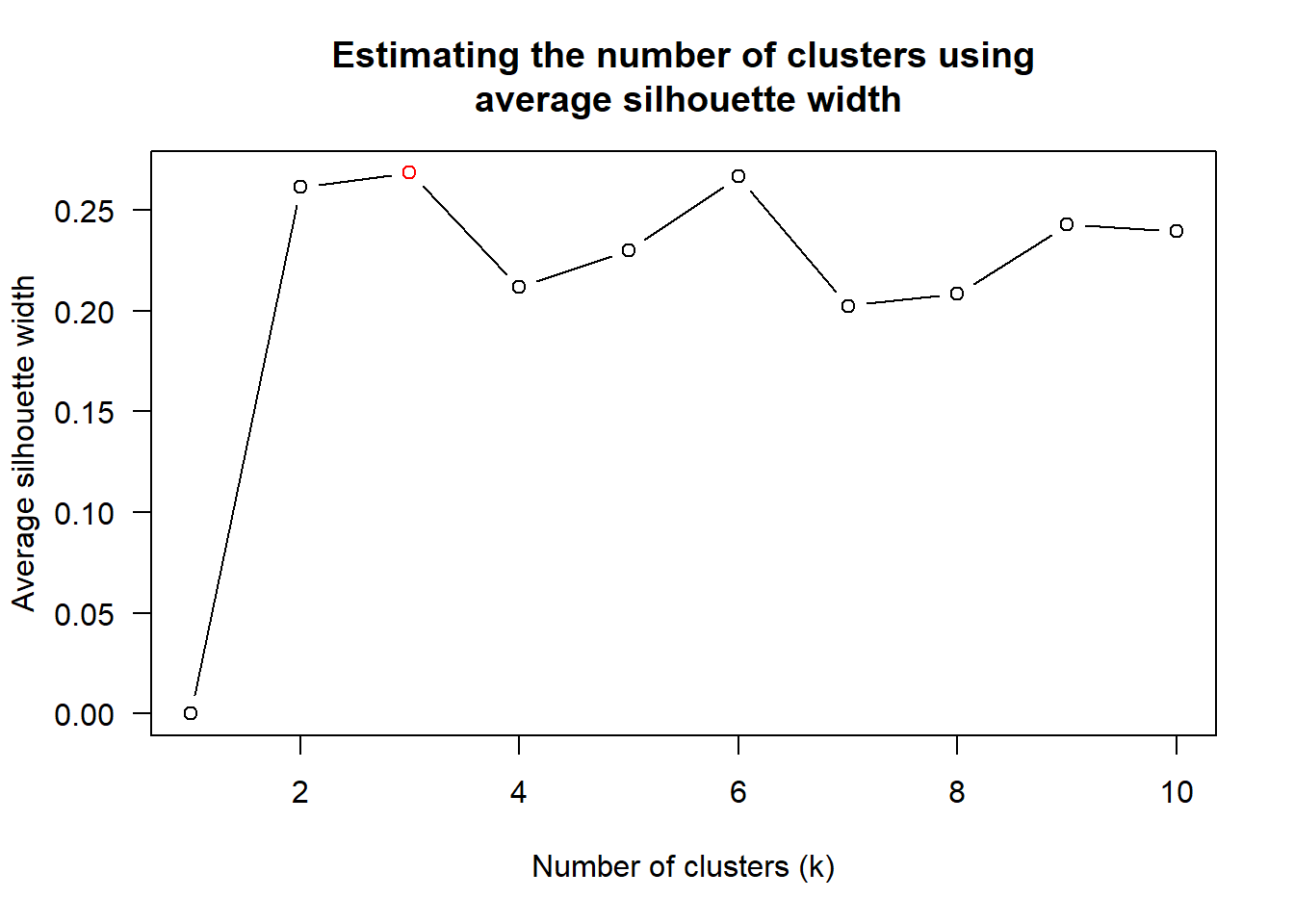 The output table shows that “average” method should be used because it gives the highest optimum value. Next, find_k() is used to determine the optimal number of cluster.