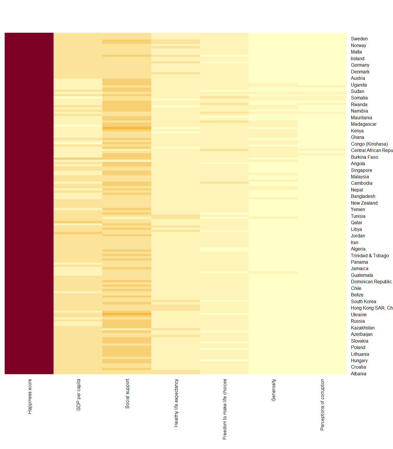 This heatmap is not really informative. Indeed, the Happiness Score variable have relatively higher values, what makes that the other variables with small values all look the same. Thus, we need to normalize this matrix. This is done using the scale argument. It can be applied to rows or to columns.