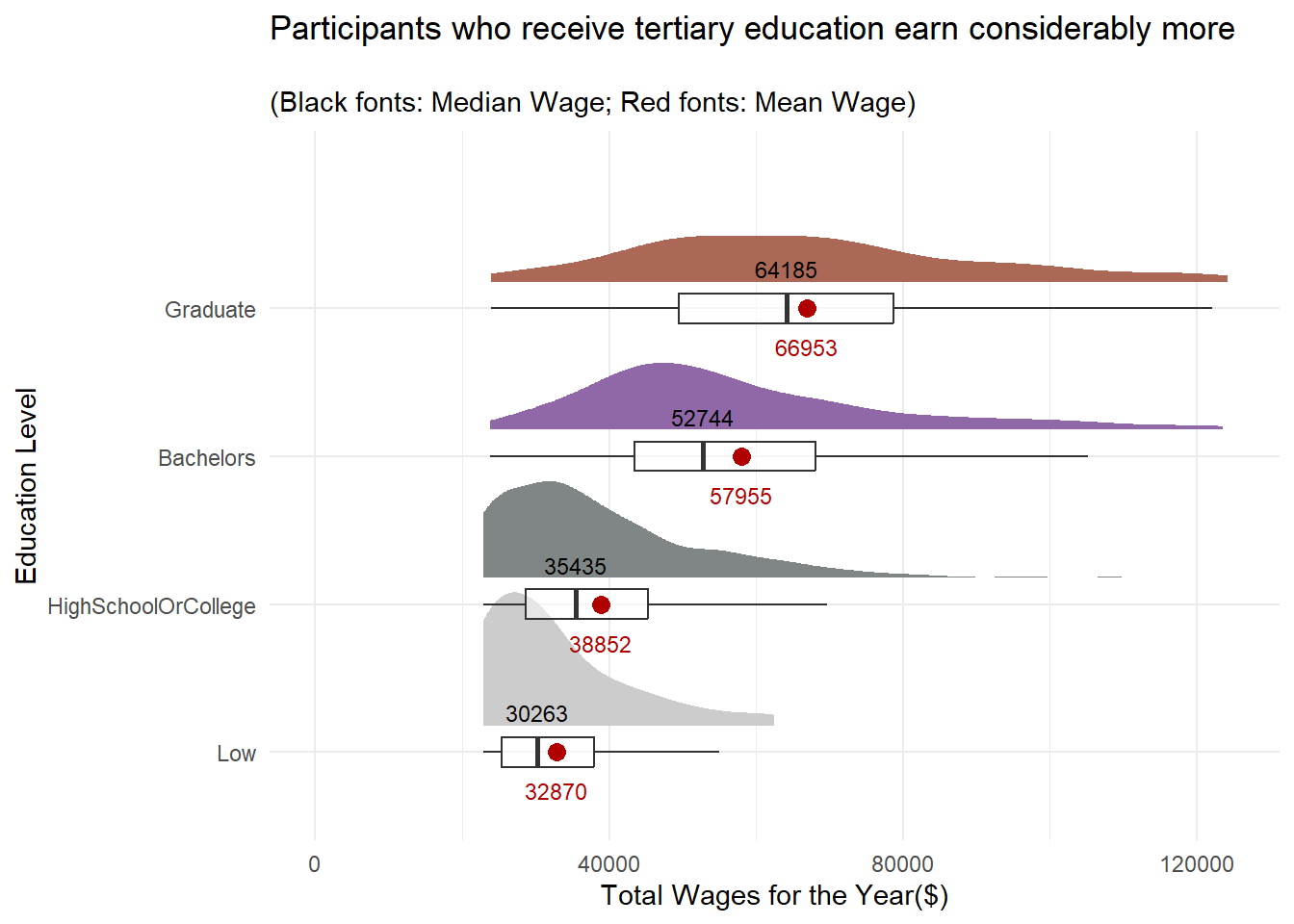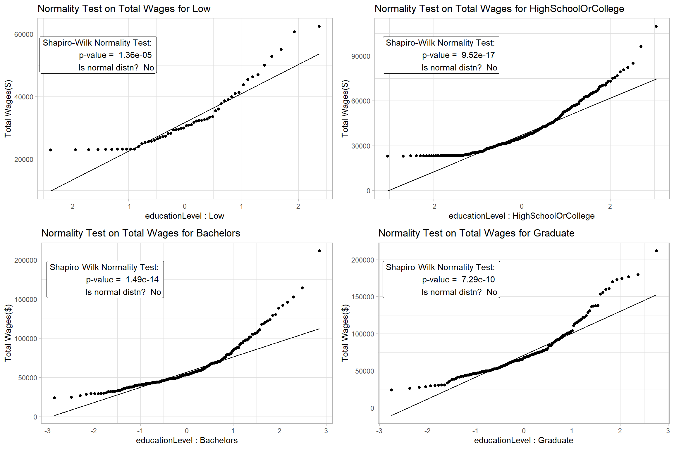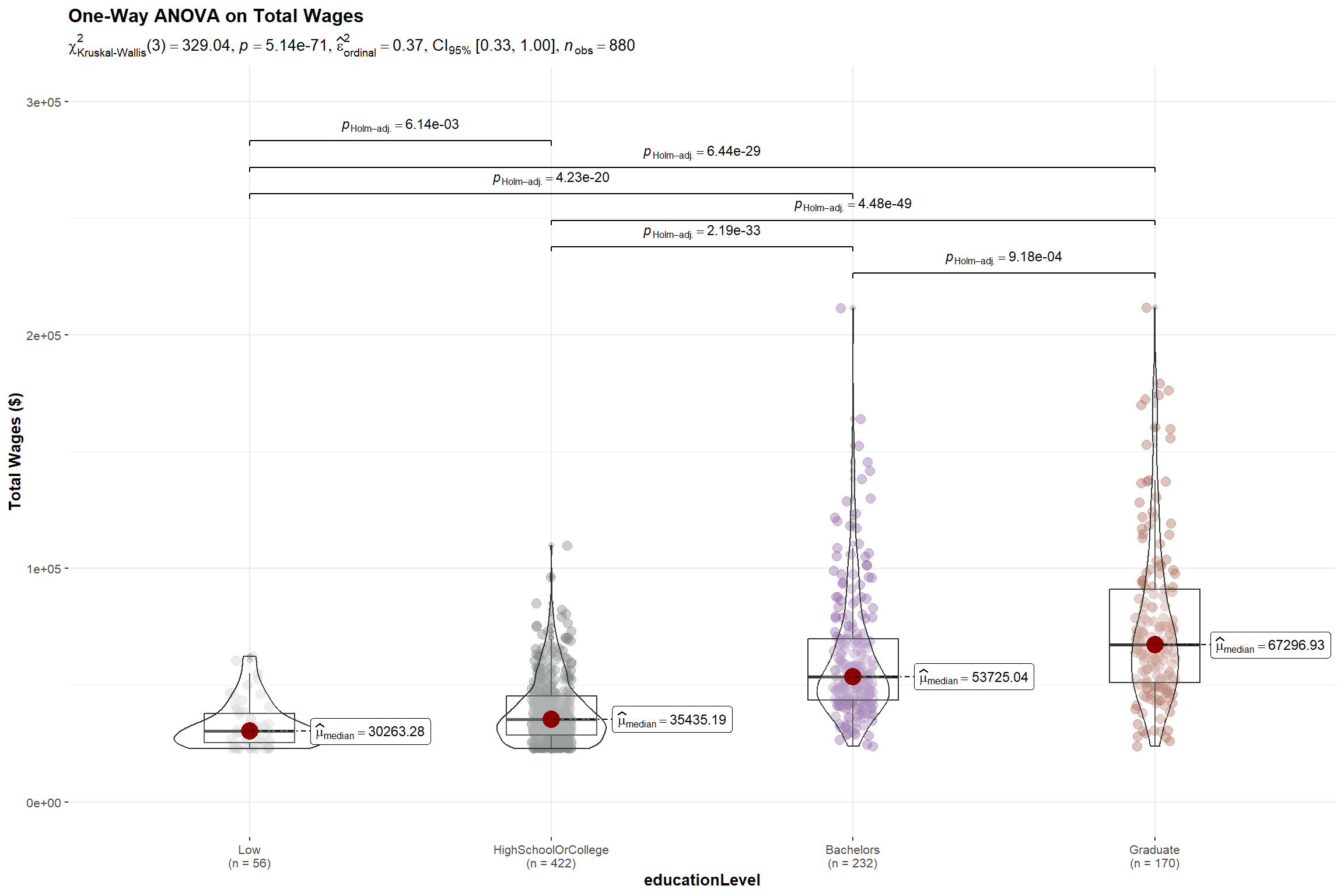 The p-value of the Kruskal-Willis Test is < 0.05 and there is a statistically significant difference in total wages. This is further supported by the pairwise comparison of total wages between the education levels which shows significant differences in their wages among all levels.