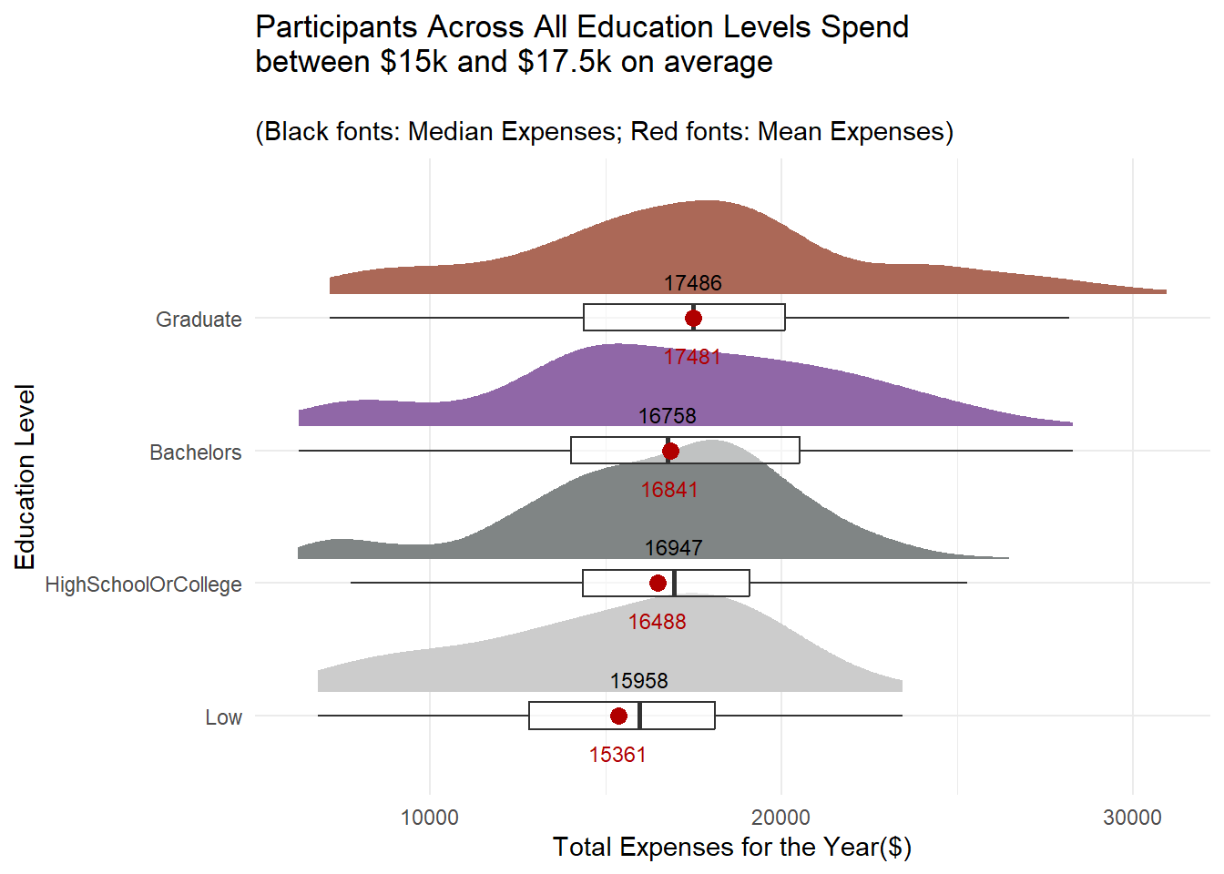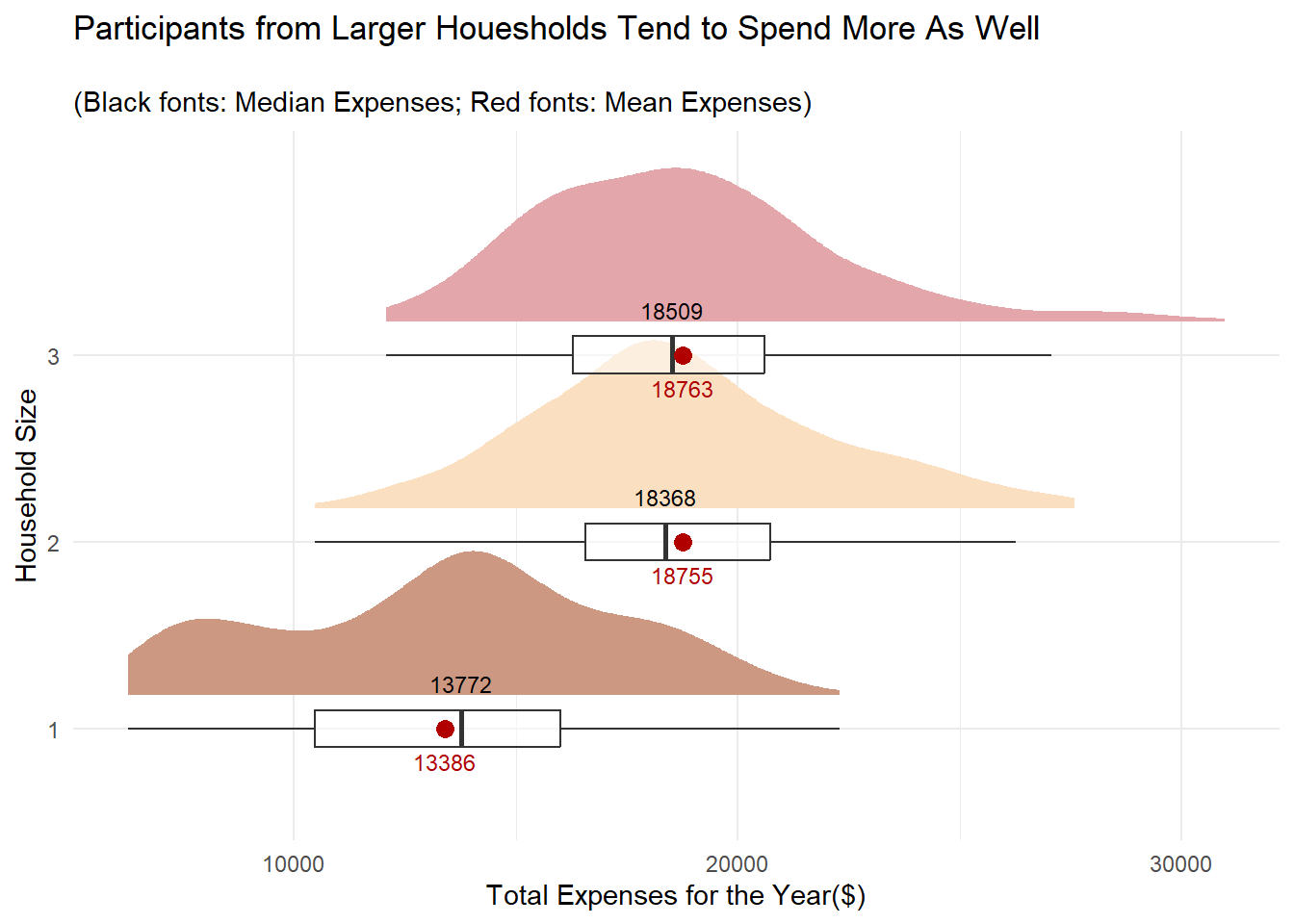 To do this, we have to first extract the individual expenses items of the 880 participants for the year before charting an interval plot by expense type.