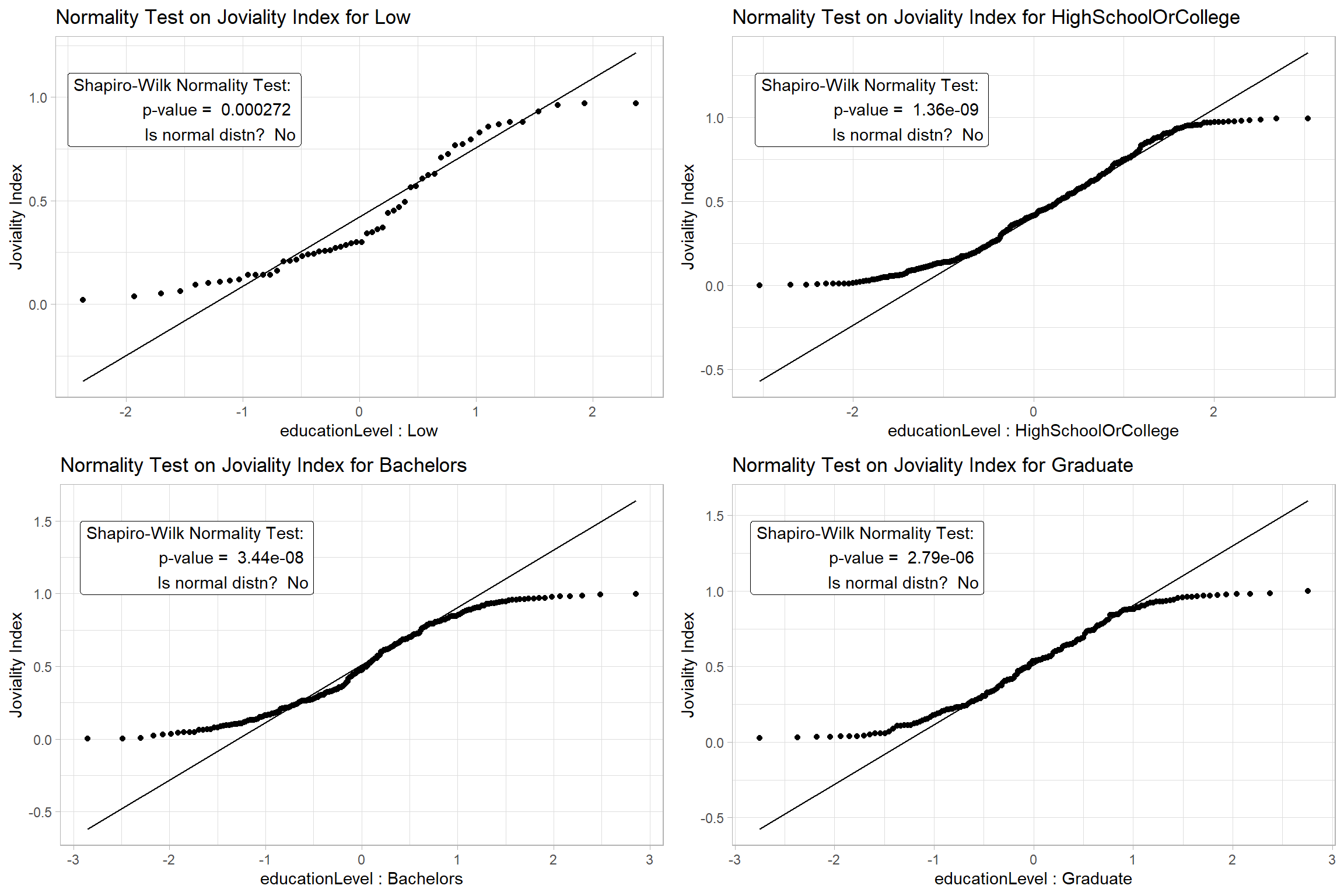 - H0 = The Joviality Index data for each Education Level is normally distributed at 0.05 level of significance