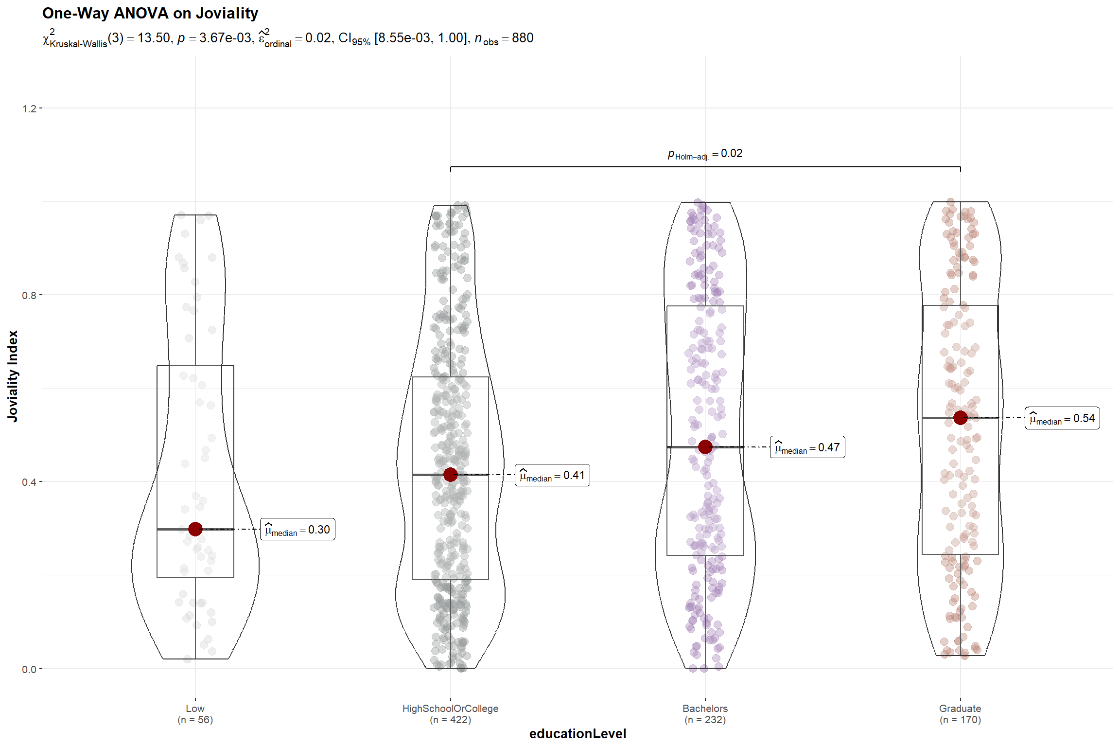 - H0 = There is no difference between the median joviality index of the participants with different education level at 0.05 level of significance.