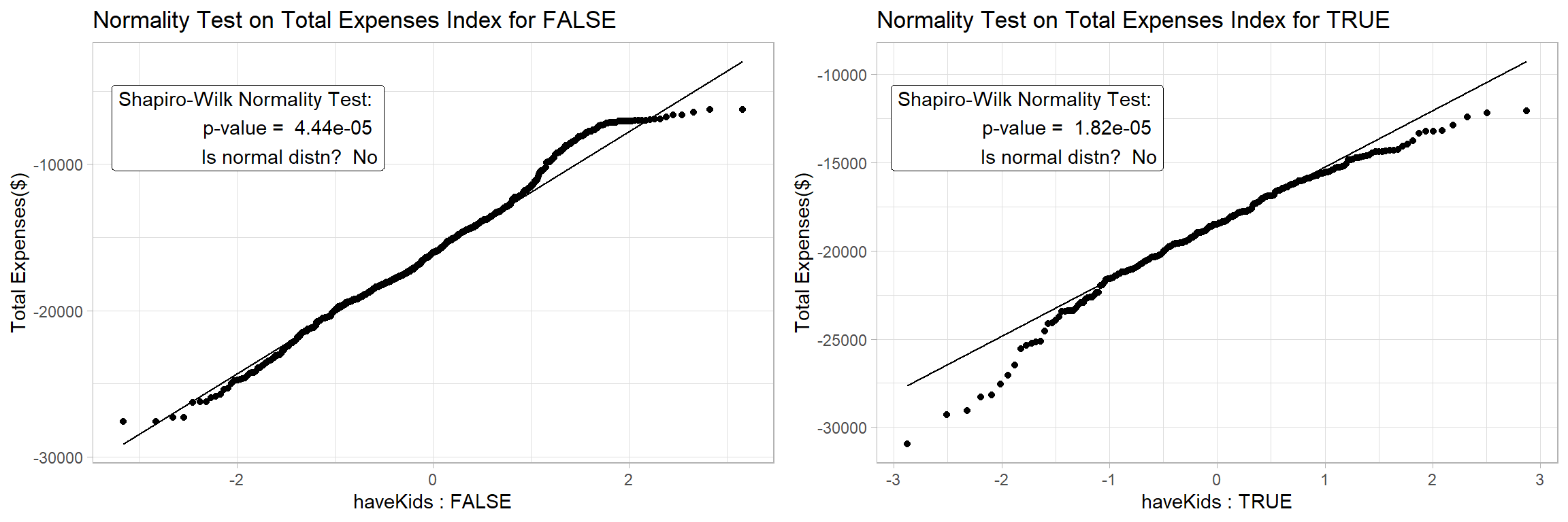 - H0 = The total expenses for households with and without kids is normally distributed at 0.05 level of significance