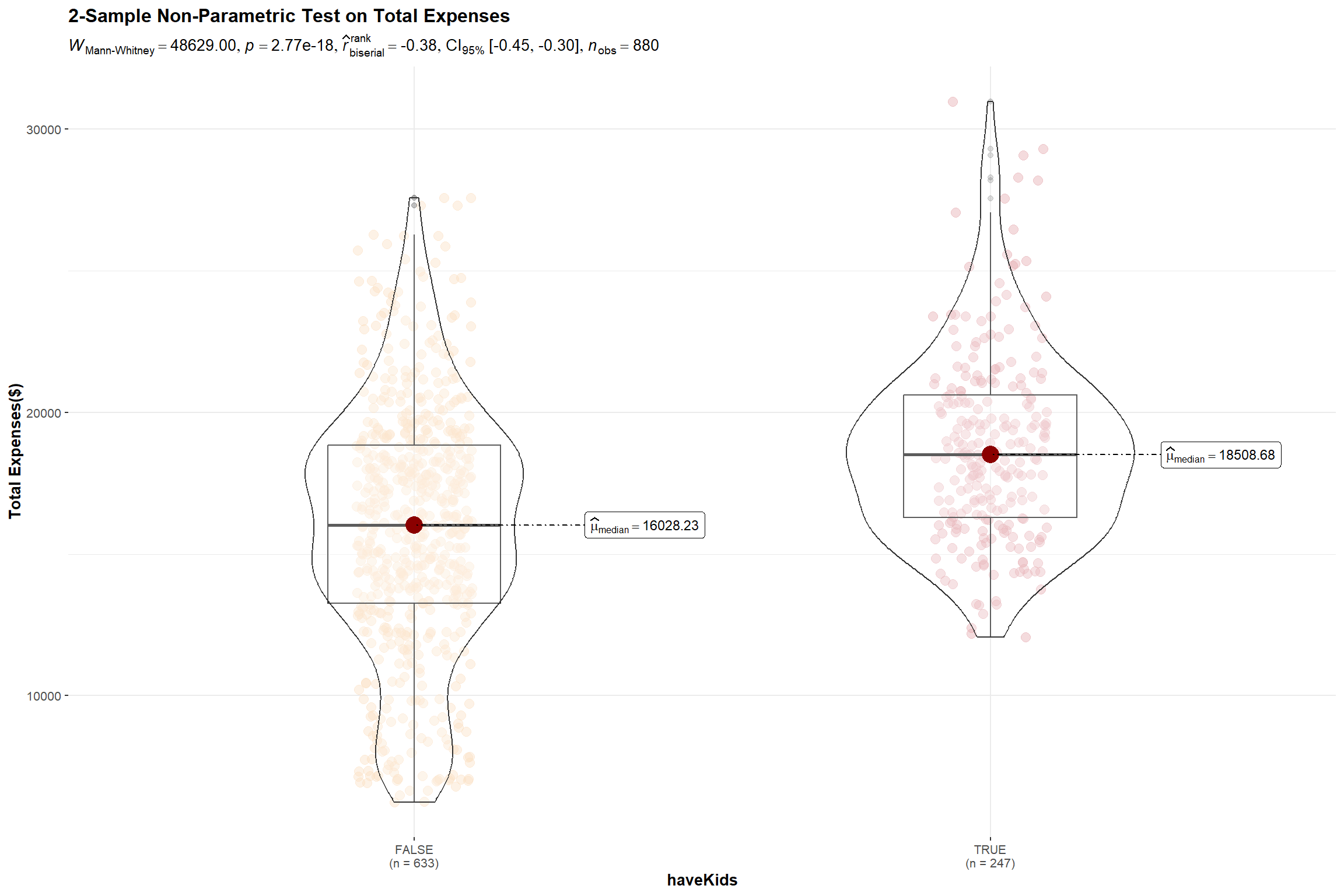 title = "2-Sample Non-Parametric Test on Total Expenses",