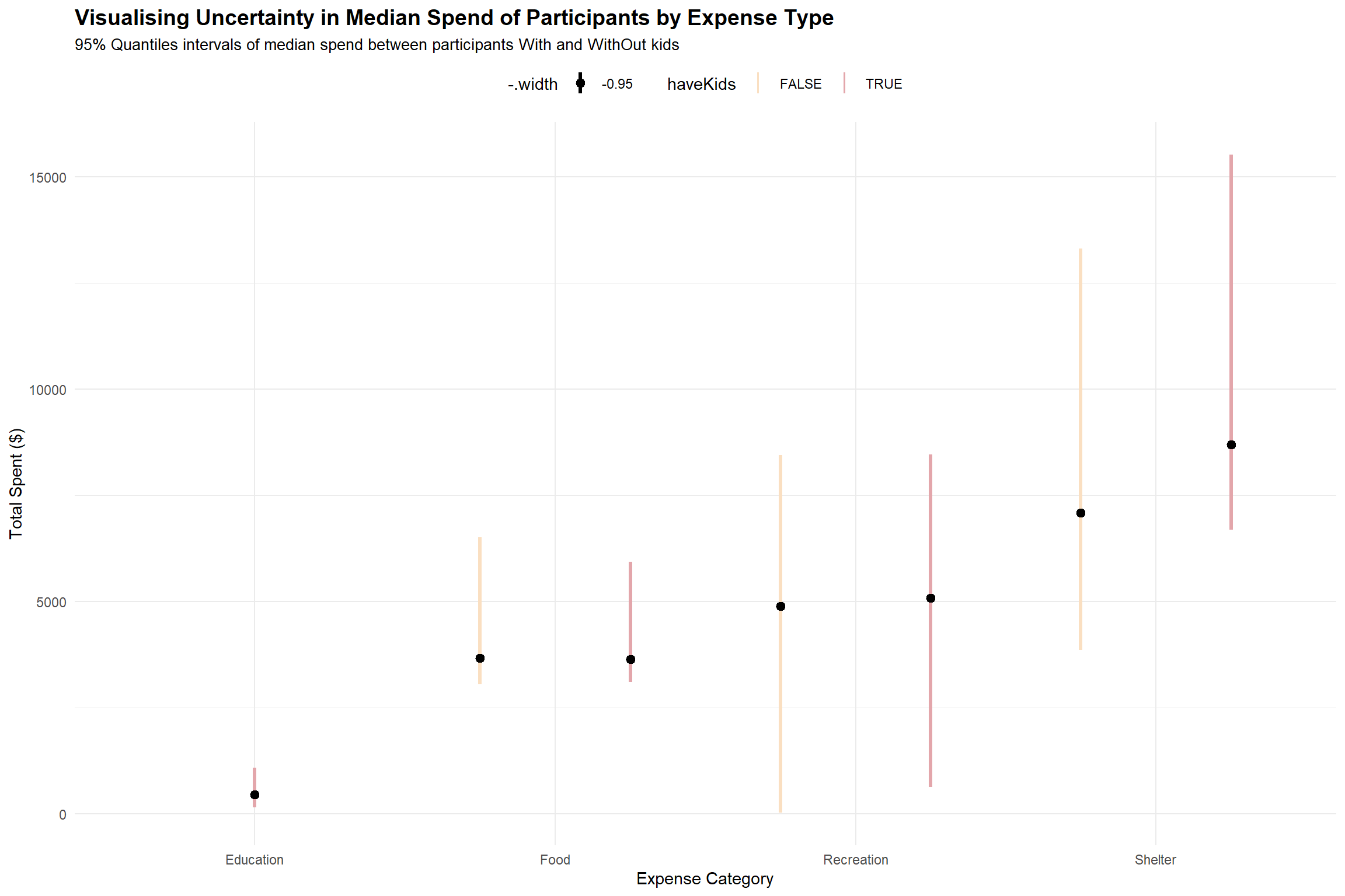 For each expense item, we want to compare the spent by households with and without kids. To place each pair of interval lines together, we have to set the fill argument of the aes() function to the haveKids attribute, and set the position argument in the stat_pointinterval() function to ’position_dodge()’.