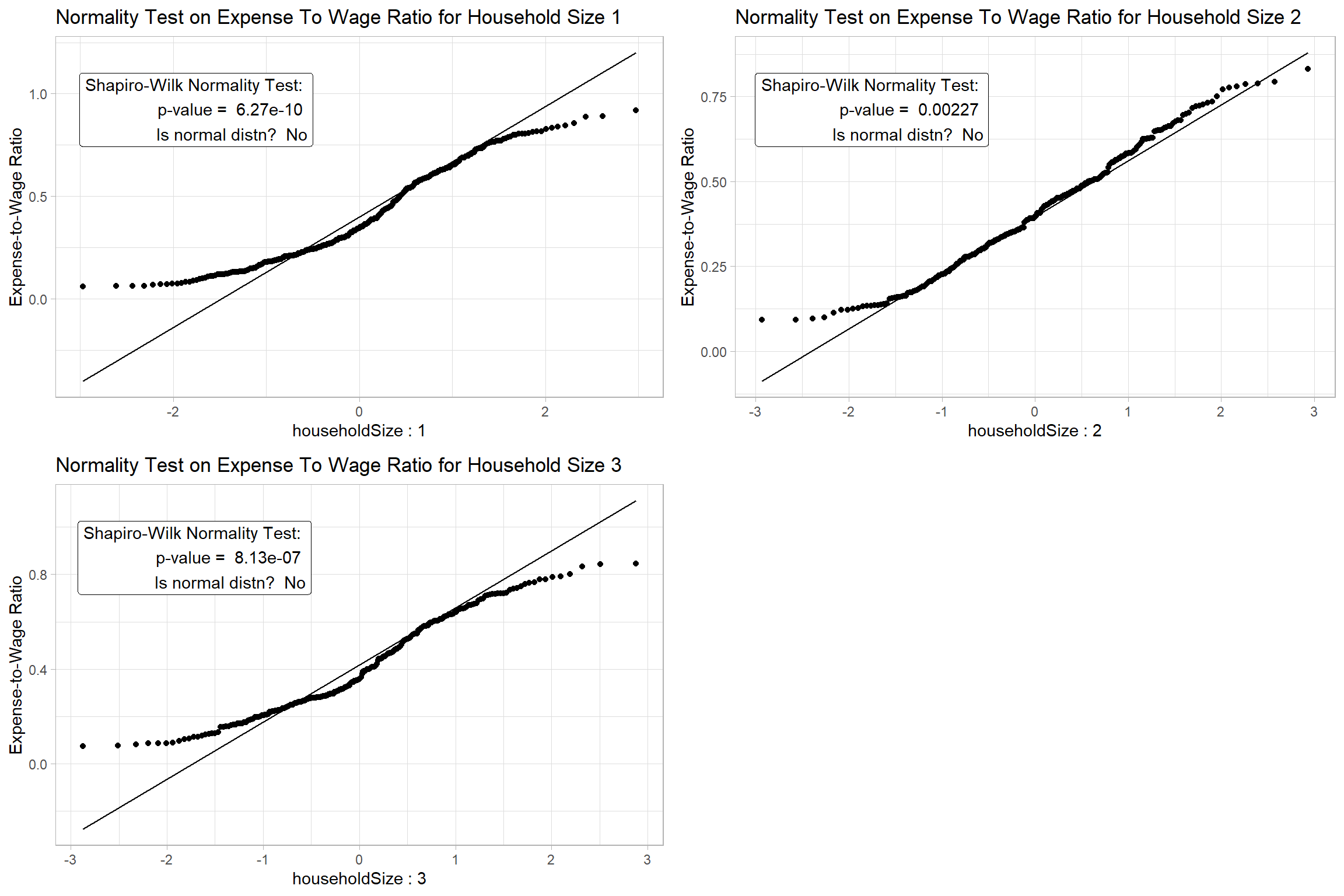- H0 = The expense-to-wage ratio for different household sizes is normally distributed at 0.05 level of significance