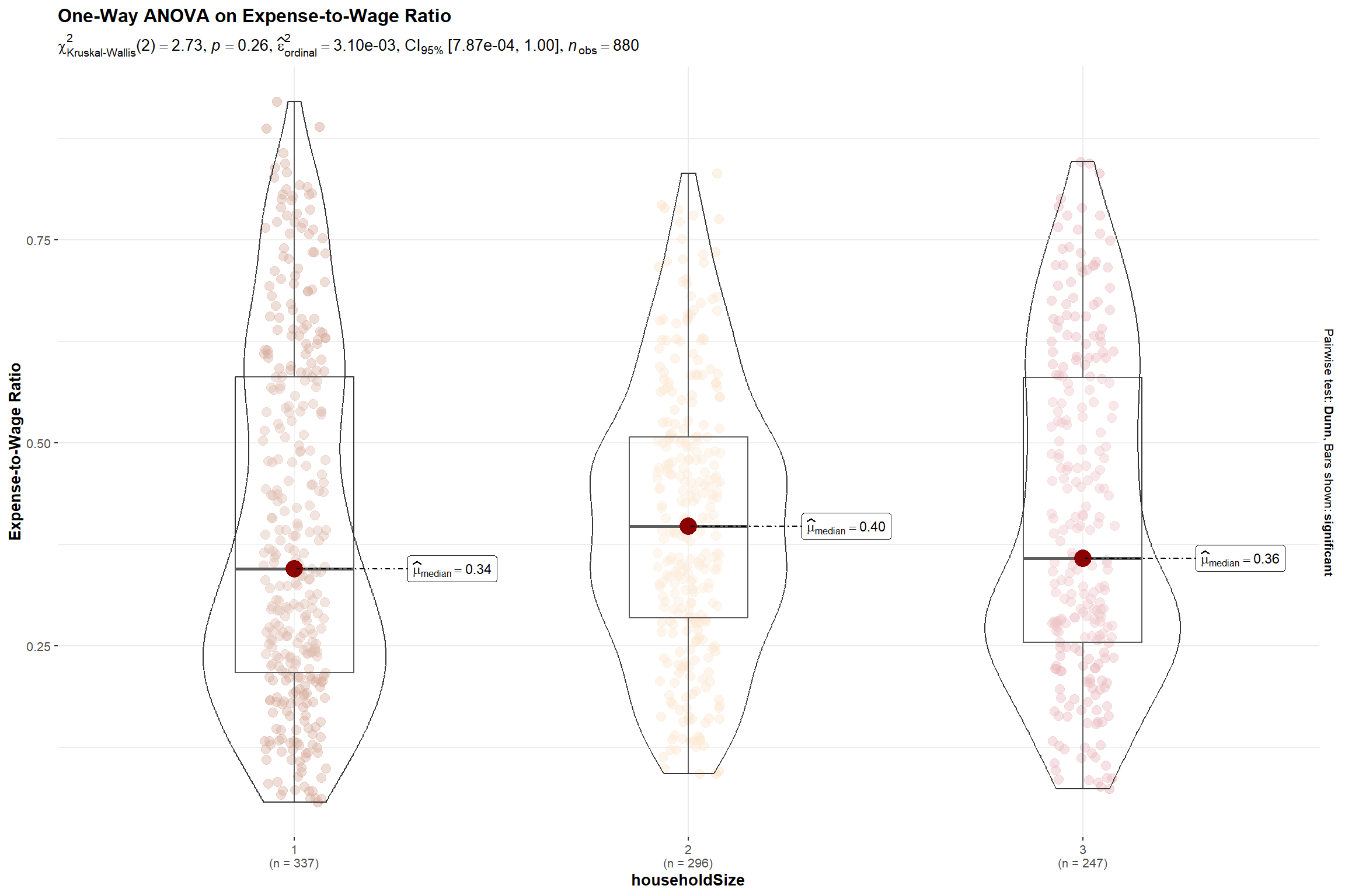 - H0 = There is no difference between the expense-to-wage ratio of the participants with different household size at 0.05 level of significance.