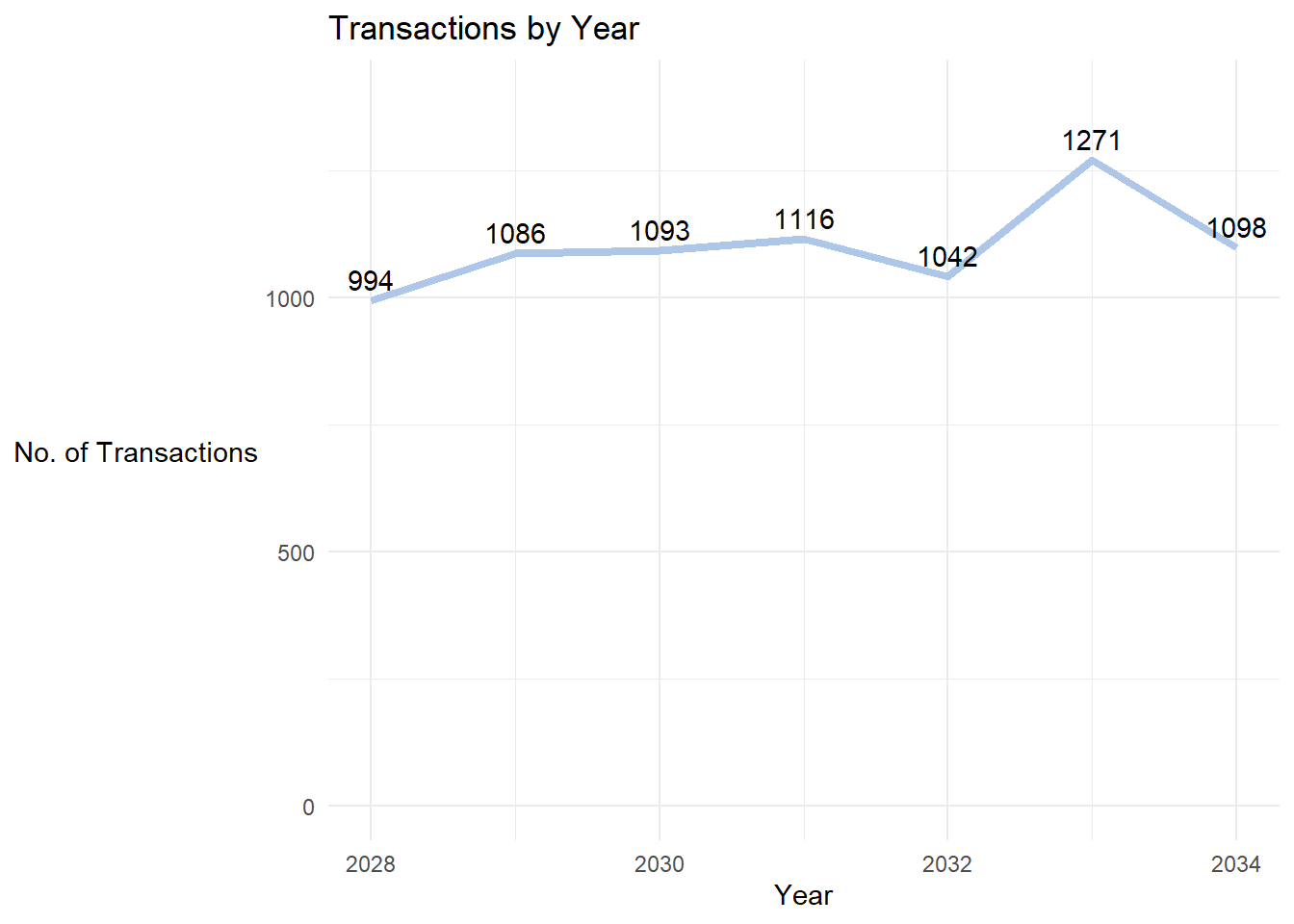 There are 7 years of transactions, ranging from 1-Jan-2028 to 30-Dec-2034