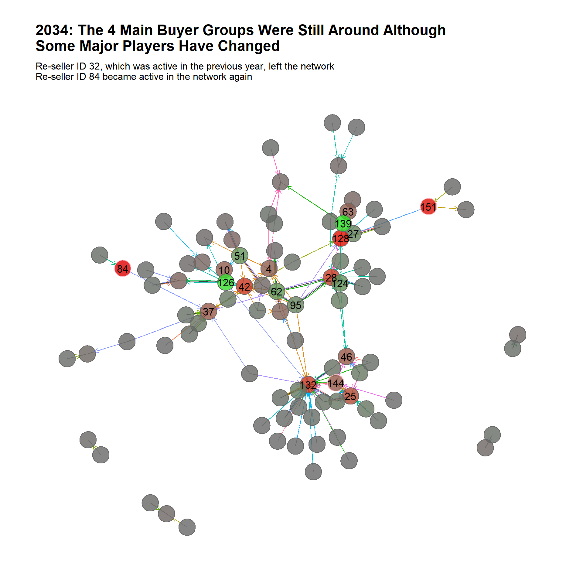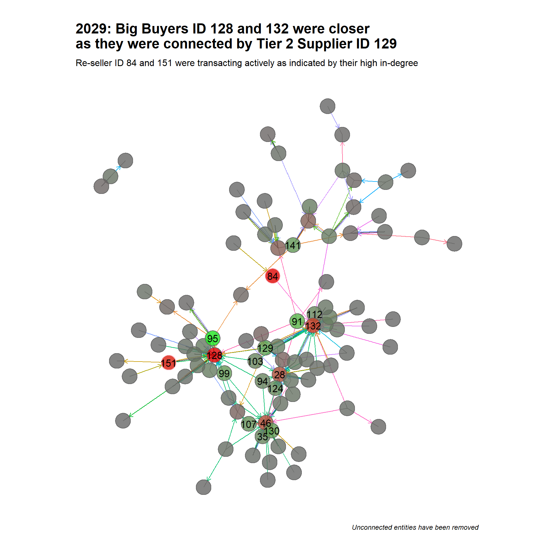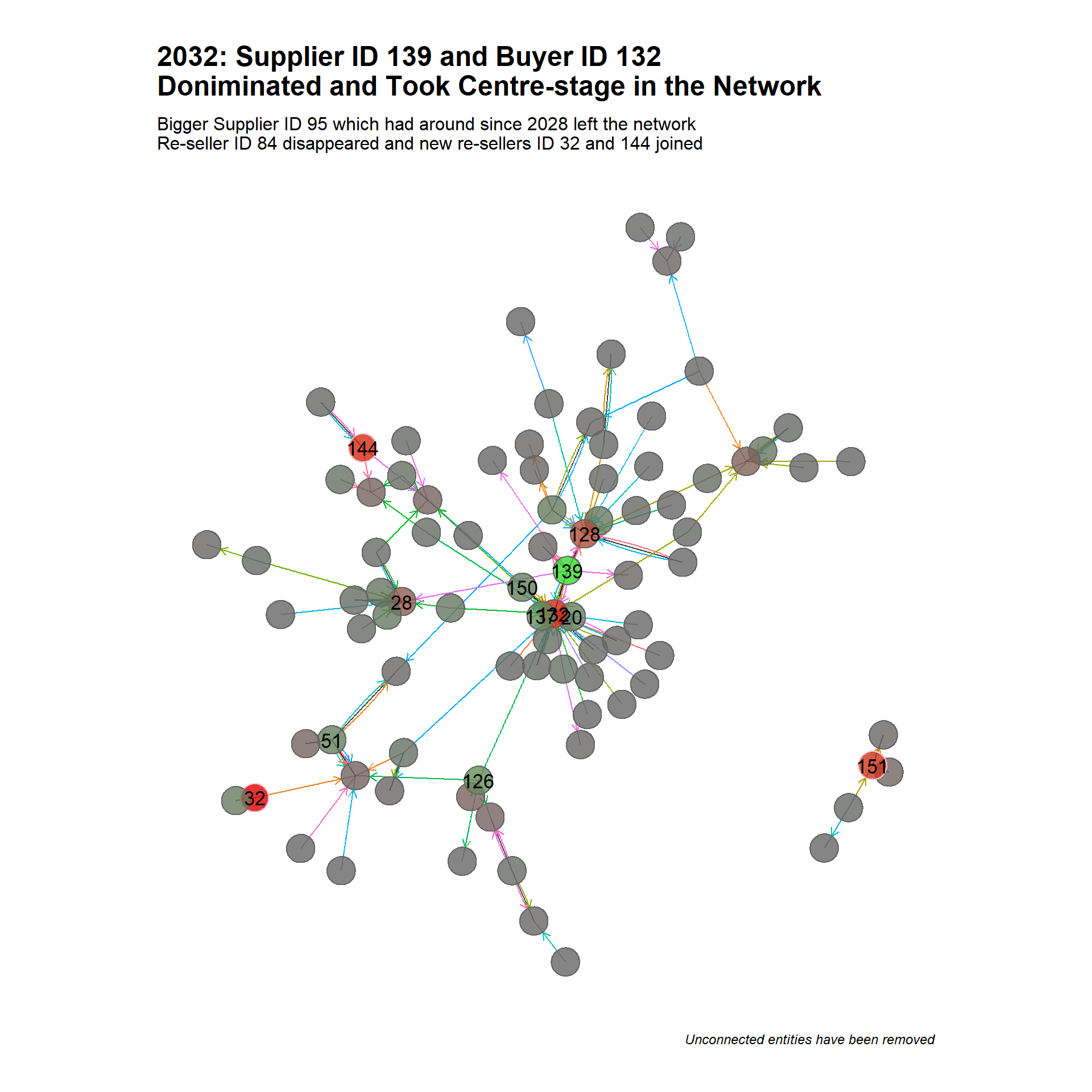 Ltd did not trade with with primary suppliers directly. Instead, it played an intermediary role, acquiring its goods and products from 2 other re-sellers before supplying them to end buyers. In the temporal analysis, we noted that Ltd existed from the community in Year 2032, 3 years after its appearance in Year 2029. Thereafter, it became active again in Year 2034.