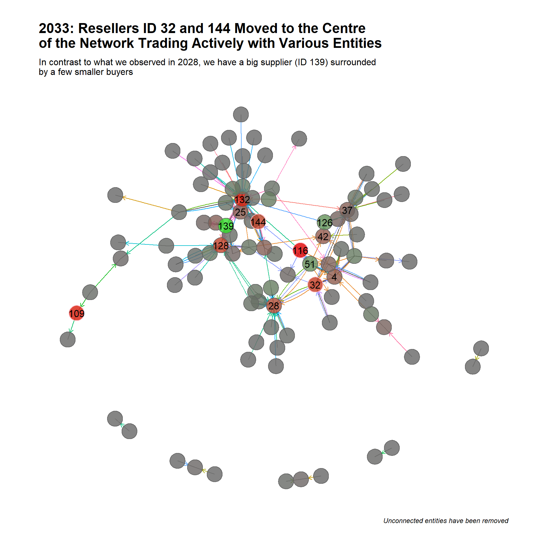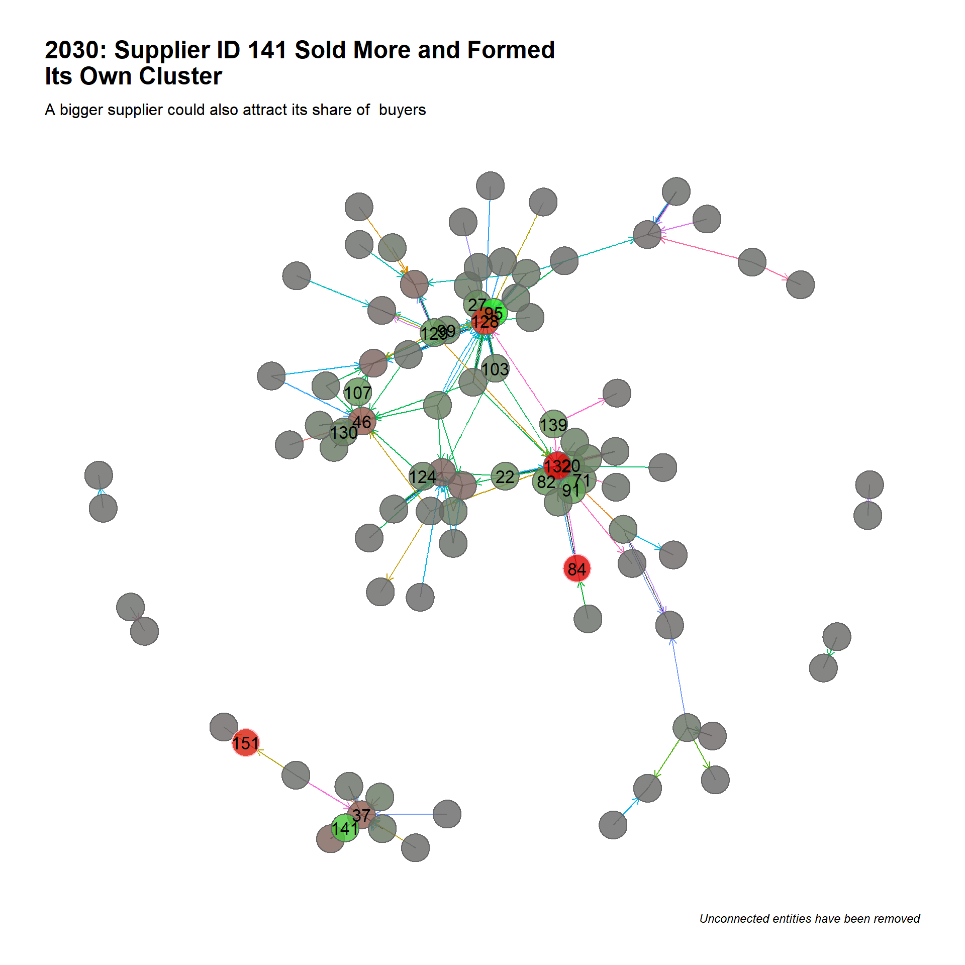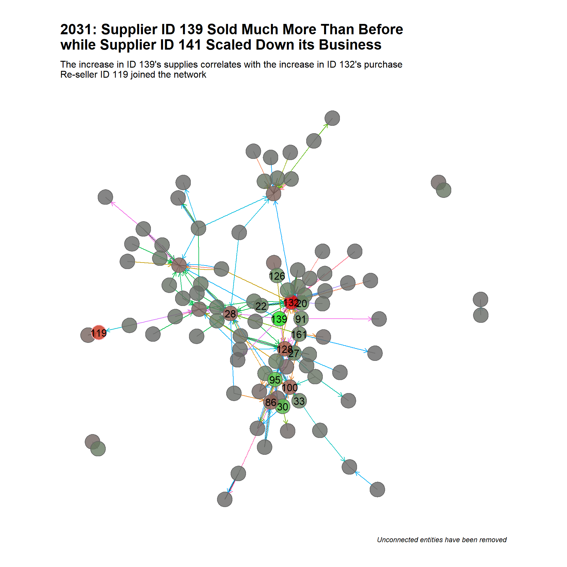 Ltd did not trade with with primary suppliers directly. Instead, it played an intermediary role, acquiring its goods and products from 2 other re-sellers before supplying them to end buyers. In the temporal analysis, we noted that Ltd existed from the community in Year 2032, 3 years after its appearance in Year 2029. Thereafter, it became active again in Year 2034.