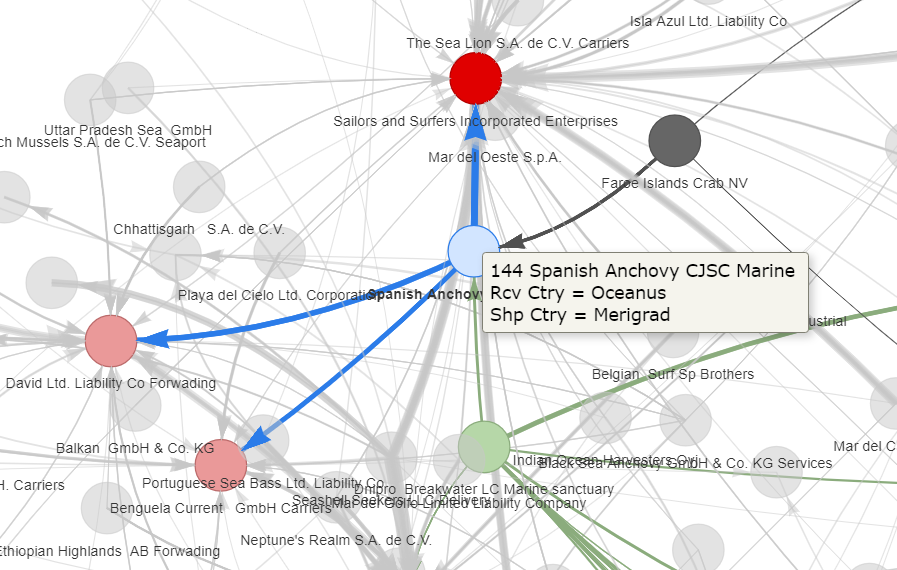 This analysis focuses on a subset of edge transactions that involve live, fresh, chilled, frozen seafood products, based on selected HS codes within a chosen community. By doing so, we focused on and uncovered the trading patterns of various entities and the business models they adopted within the community. Although we found some re-sellers suspicious of being involved in transshipment, it would be premature to conclude that the transactions involved IUU fishing.