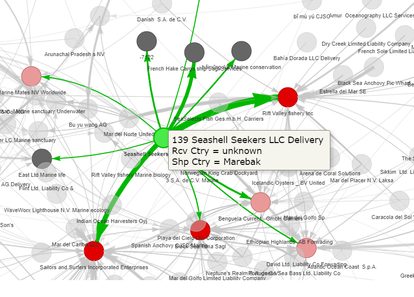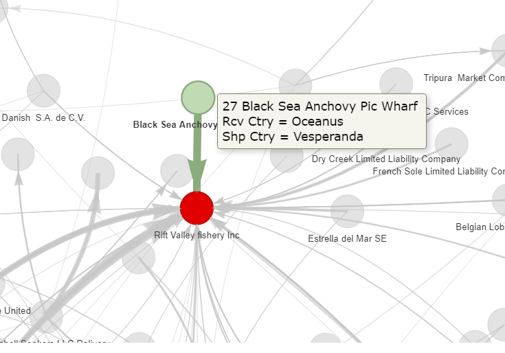 Black Sea’s sole customer in the network was Rift Valley fishery Inc, trading in shrimps and prawns. Black Sea fits the profile of a large fishing vessel or entity, supplying its catches to Rift Valley directly.