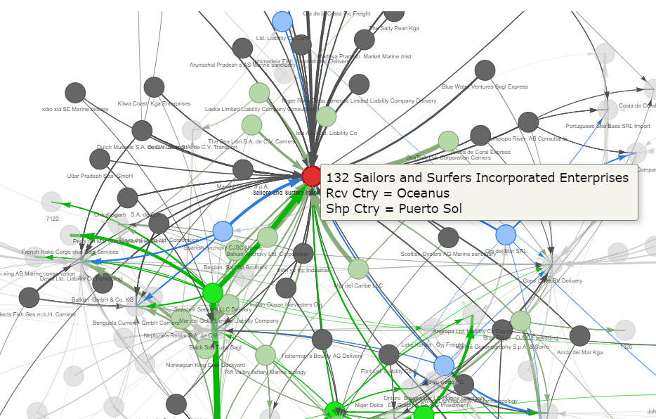 The country of Oceanus has sought FishEye International’s help in identifying companies possibly engaged in illegal, unreported, and unregulated (IUU) fishing. As part of the collaboration, FishEye’s analysts received import/export data for Oceanus’ marine and fishing industries. However, Oceanus has informed FishEye that the data is incomplete. To facilitate their analysis, FishEye transformed the trade data into a knowledge graph. Using this knowledge graph, it hopes to understand business relationships, including finding links that will help stop IUU fishing and protect marine species that are affected by it.