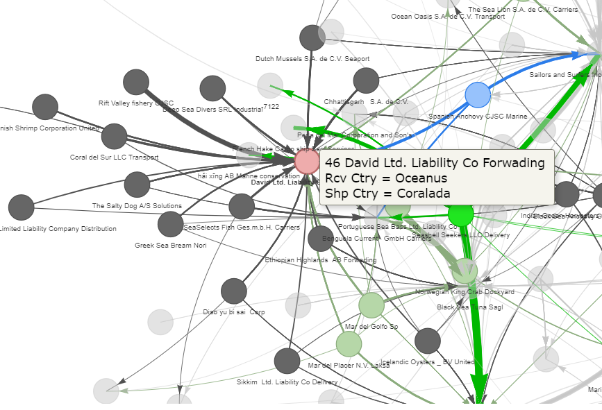 As seen from the image, David sourced its goods and products from a various suppliers, but mainly from smaller suppliers. It traded mainly in fishes as opposed to other types of seafood. From its business name, David was a forwarder; however, this was not apparent from network.